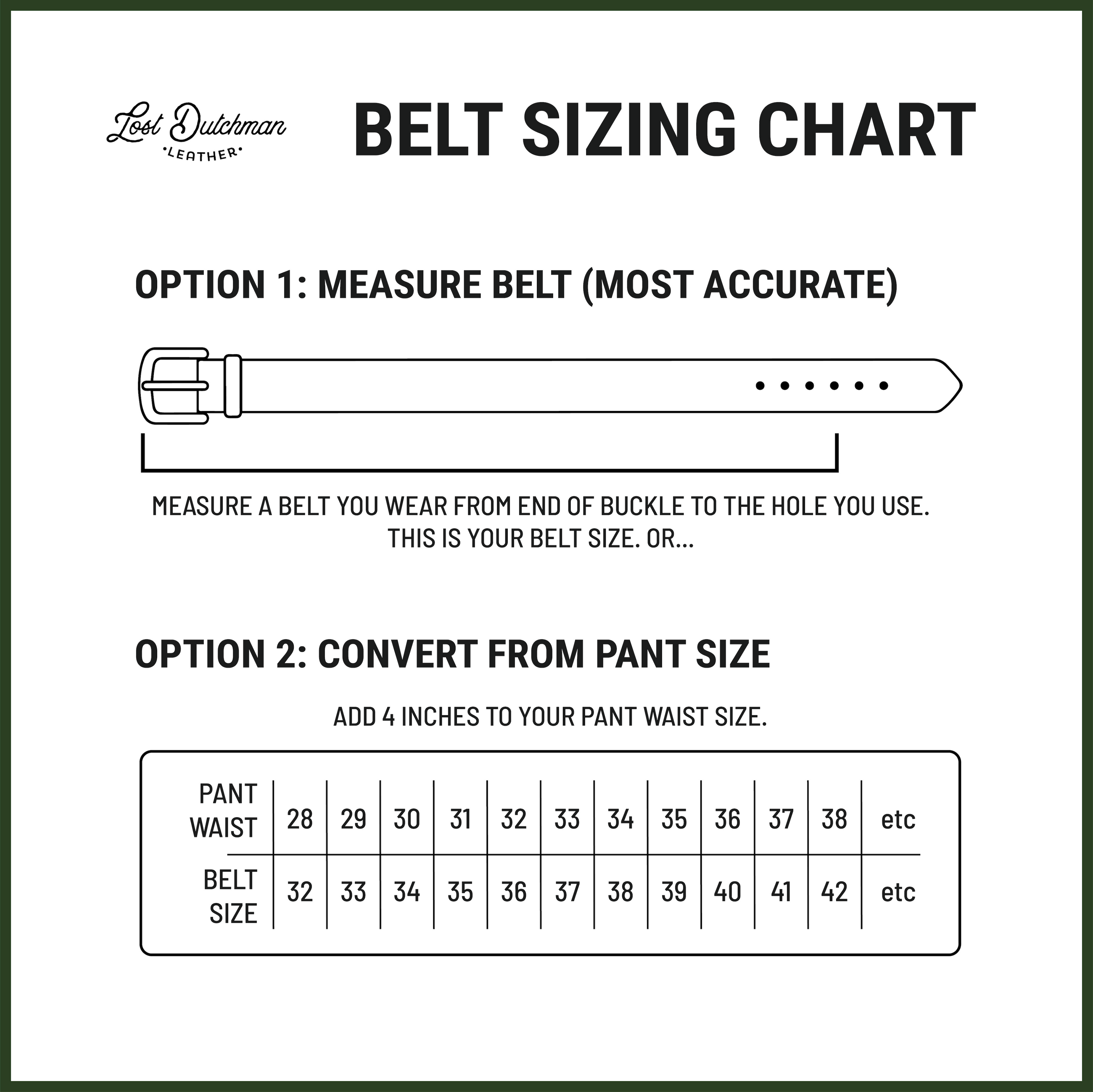 Belt Size can also be calculated by adding 4 inches to your pants waist size. This is not as accurate as measuring your current belt.