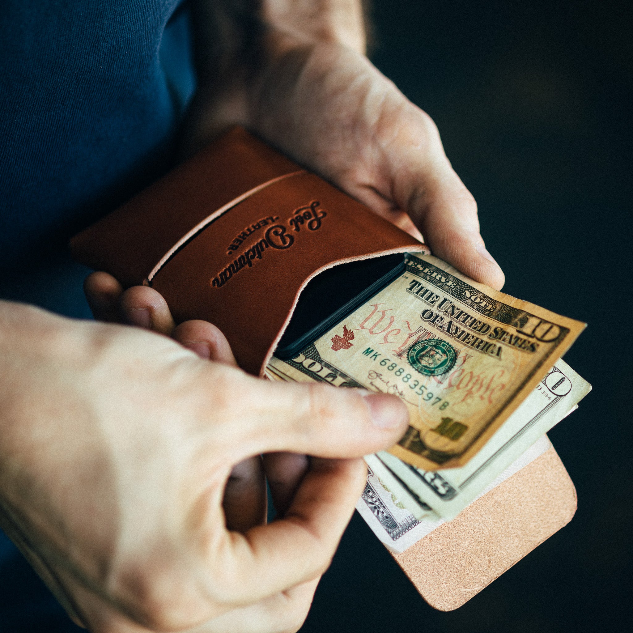 The Finnigan – the minimal card holder built to last a lifetime. Made 100% in the USA, this leather card wallet easily fits 8+ cards and folded cash, with a flap that keeps contents secure. All while remaining barely bigger than a credit card. With full-grain leather, a lifetime stitching guarantee, and endless customization, it's just wrong to settle for less. This is what true minimalism looks like.